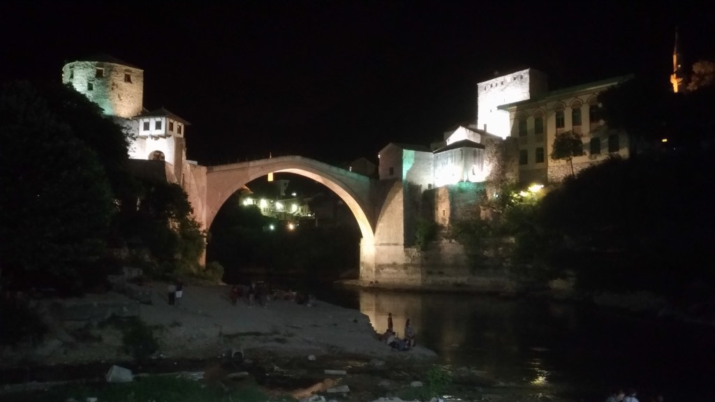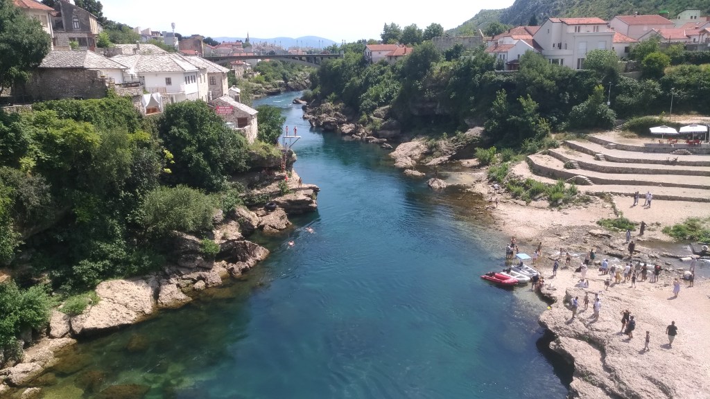 Con Mostar è stato amore a prima vista. Mi sono fatto subito travolgere dalla magia di questa città, dolce, calorosa, affascinante ed a tratti malinconica. La cosa che mi colpì molto in quei giorni afosi fu l’unicità del posto, perchè nonostante la posizione geografica, nel cuore dell’ Europa, Mostar era talmente autentica che di Europeo aveva ben poco. E’ la più grande città dell’ Herzegovina, con i suoi 110000 abitanti, e durante la dominazione ottomana, dal 1481 al 1879 furono costruite strutture islamiche molto belle tra cui la moschea Karadoz Begova e lo Stari Most, il bellissimo ponte costruito da Solimano il magnifico nel 1557, divenuto col passare degli anni il simbolo della città, e purtroppo anche il simbolo della guerra dei Balcani. Mostar è stato uno dei luoghi più falcidiati dalla folle guerra Jugoslava, si perchè se all inizio i mussulmani bosniaci dovevano difendersi insieme ai croato bosniaci dall’ esercito serbo, dopo un pò di tempo i bosniaci mussulmani si ritrovarono a doversi difendere da tutte e due le forze nazionaliste, con conseguenze disastrose culminate col vergognoso attacco al ponte Stari Most, bombardato e distrutto dalle forze croate. Il ponte non aveva nessun significato strategico, ma era un simbolo per tutta la città, congiungeva infatti le due etnie che per secoli avevano convissuto pacificamente, la parte croata cattolica ad ovest, e la parte bosniaca mussulmana ad est. Il ponte è stato completamente ricostruito nel 2004 ed è giustamente diventato patrimonio dell’ Unesco. Mostar è circondata da colline aspre e rocciose, e questa posizione la rende particolarmente afosa nelle giornate estive, ed è divisa in due dalla Narenta, lo splendido fiume blu che la percorre, creando delle bellissime lame dove fare il bagno vicino al centro cittadino, e dove dallo Stari Most si tuffano ragazzi da oltre 500 anni. Da secoli infatti ragazzi di Mostar eseguono il salto dal ponte per impressionare le ragazze del posto, ma solo nell’ ultimo ventennio lo fanno per soldi, appena le offerte dei turisti raggiungono una cifra congrua, i ragazzi compiono l’atto atletico, il ponte infatti è alto 20 metri. L’eroico gesto è stato compiuto anche da audaci turisti, finendo in rarissimi casi con un esito tragico.