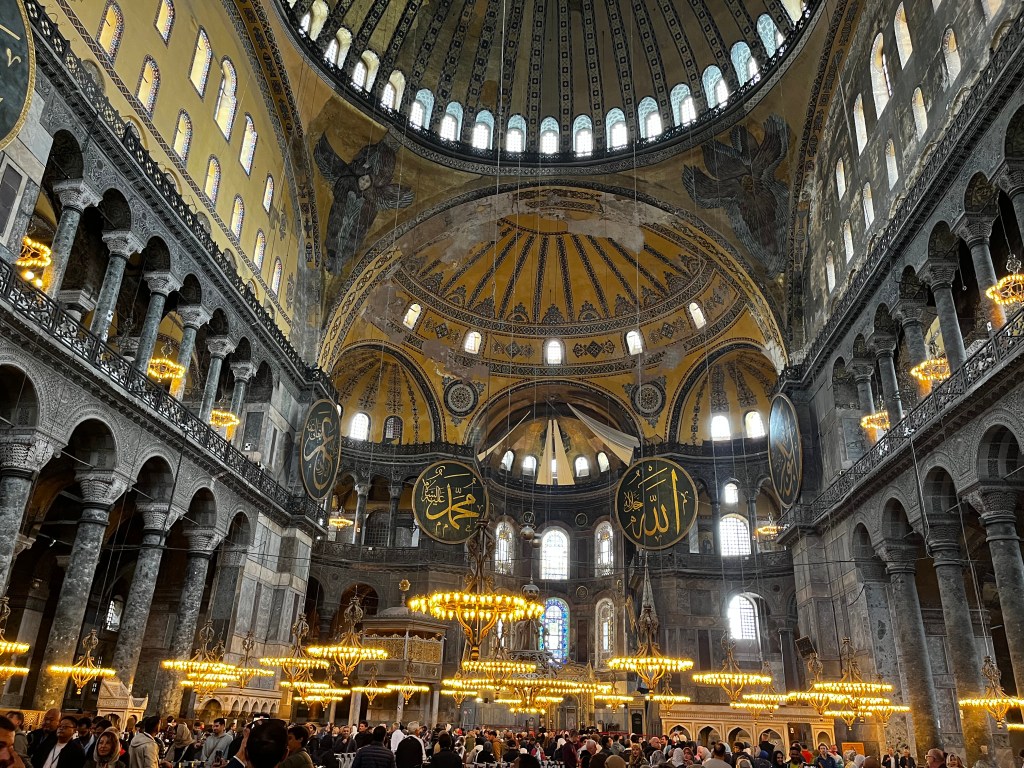 • Hagia Sophia: Costruita intorno al 600 d.c. fu cattedrale cristiana fino al 1453 quando divenne Mosche Ottomana, fino ad essere sconsacrata nel 1935. Solo nel 2020, con un decreto parlamentare, è stata nuovamente aperta al culto islamico. Si possono notare parecchi drappi con simboli islamici al suo interno che coprono affreschi cristiani